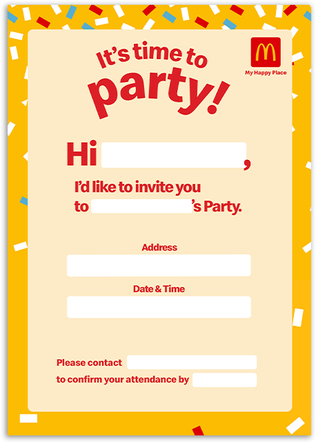 No outside food or drinks (including alcohol) allowed. McDonald’s has the right to STOP/Cancel the Party immediately for those who does not comply with the Party / site requirements. McDonald’s shall not, in such event, be liable to make any refund or other compensation.
